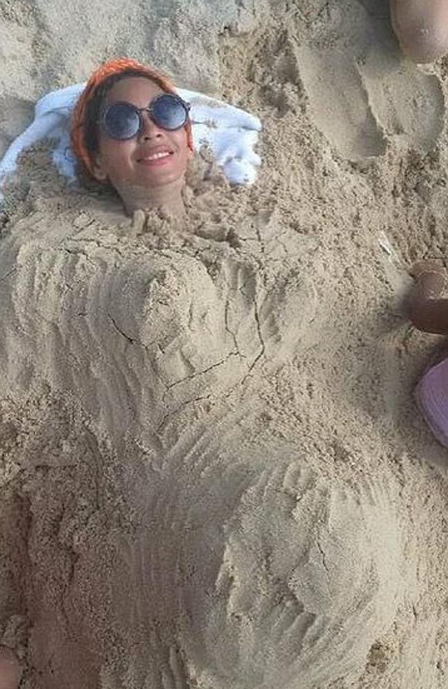Beyonceは目立ったお腹の張りの分かる、彼女自身が砂に埋もれた写真をインスタグラムに投稿し、2児妊娠のウワサをかき立てた。