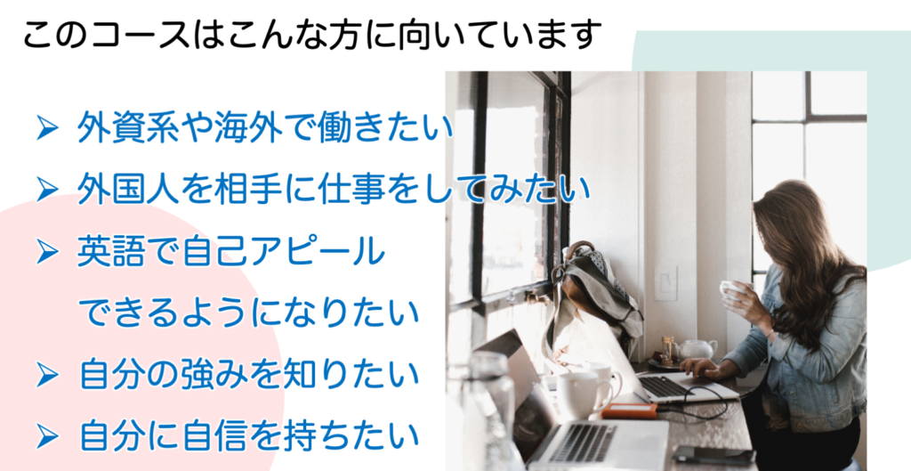 すぐにそれを使って仕事に応募できるのはもちろんのこと、あなたの強みや魅力がたっぷりと英語で書かれた書類は、見ているだけで自分の価値を客観視でき、自己肯定感が上がるのではないでしょうか。