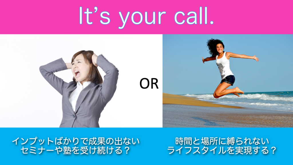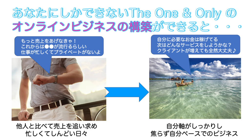 それは、自分軸をしっかり確立して、あなたにしかできないThe One & Only のビジネス、特にオンラインをベースにしたビジネスを構築させれば良いのです。