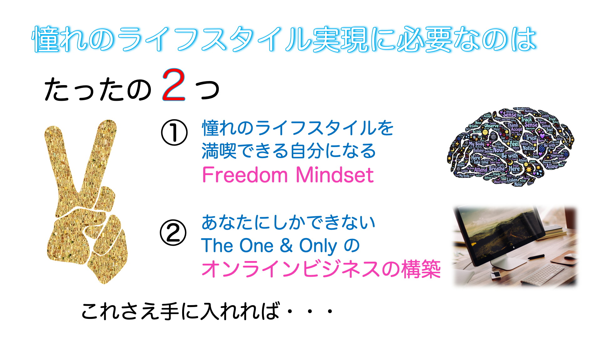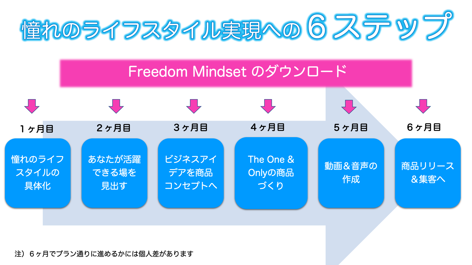 このFreedom Mindset とオンラインビジネスの構築をしていくことで、時間と場所に捉われない『憧れのライフスタイル』を6ヶ月で確立していくのが