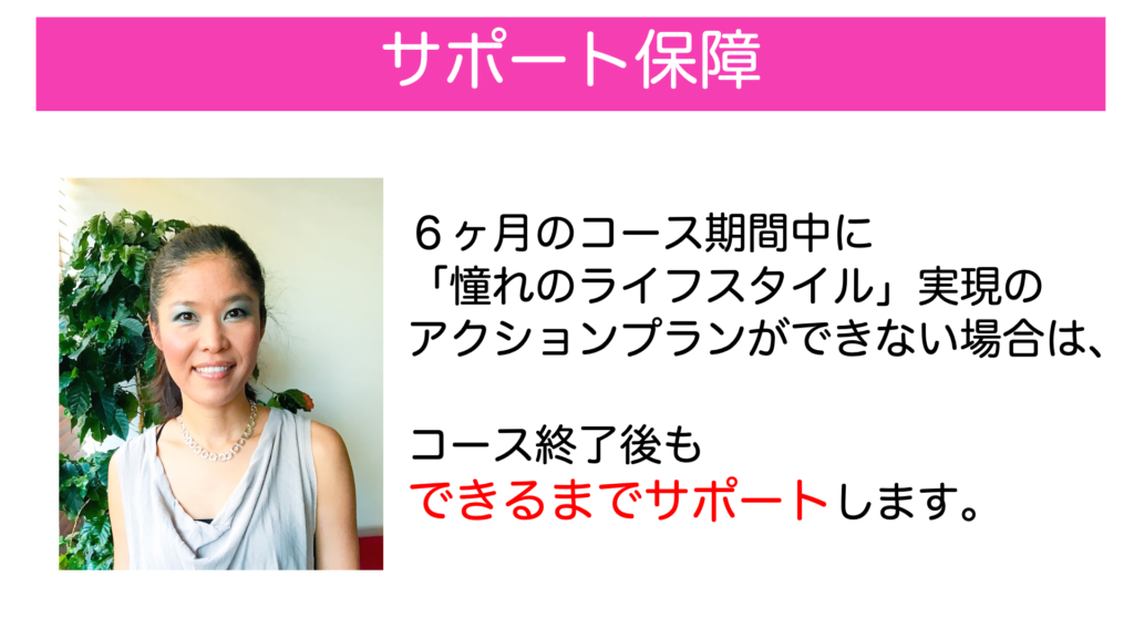 このサポート保障は、恐らく日本初、いえ世界初じゃないかなと思っています。そのくらい、あなたの憧れのライフスタイル実現に向けて本気で考えています。