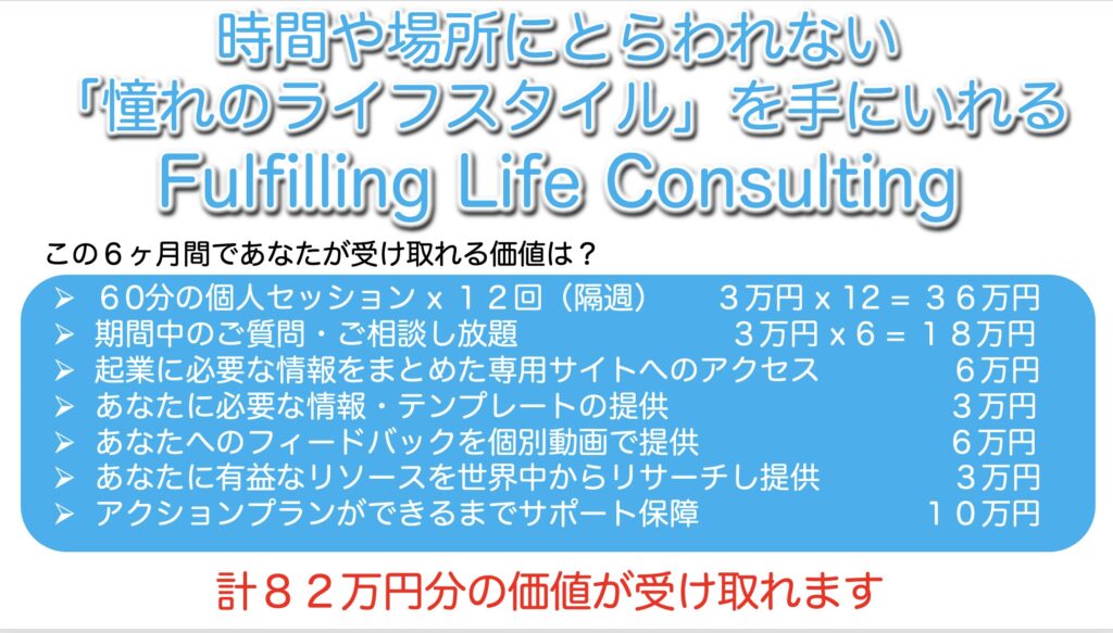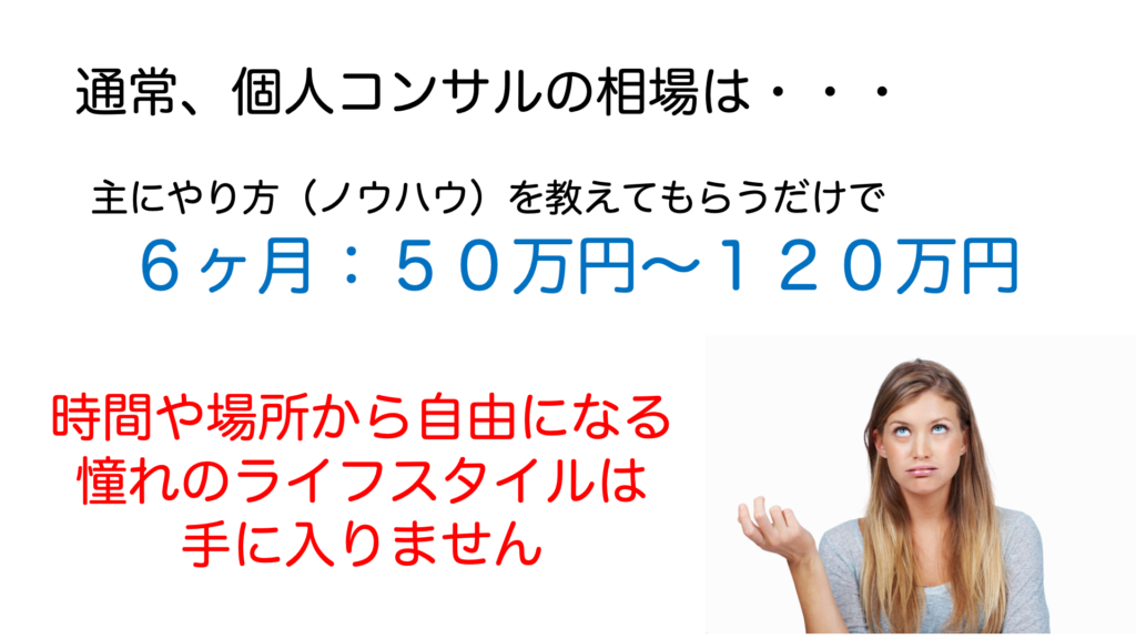 料金に差があるのは、そのコンサルタントの力量や経験の差ですね。でも、どれだけ凄腕のコンサルタントからでも、時間や場所に捉われない『憧れのライフスタイル』は手に入りません。なぜなら、そういった生活をコンサルタントの方自身が送っていないからです。