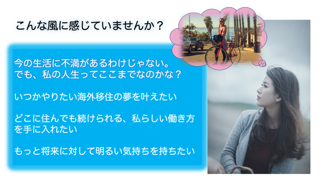 でも今では、私にしかできない商品を開発し、それを「素晴らしいです!」と言って買ってくださるクライアントさんに出会えるビジネスを確立することができました。そして、当時の私にとっては夢のまた夢、そんなことができるわけがないと思っていた「時間と場所にとらわれないライフスタイル」を手に入れることまでできるようになったのです!数年前までは自分の人生に限界を感じ、将来に対して明るい気持ちを持てなかったのに、どうやってたった数年の内に変わることができたのか・・・