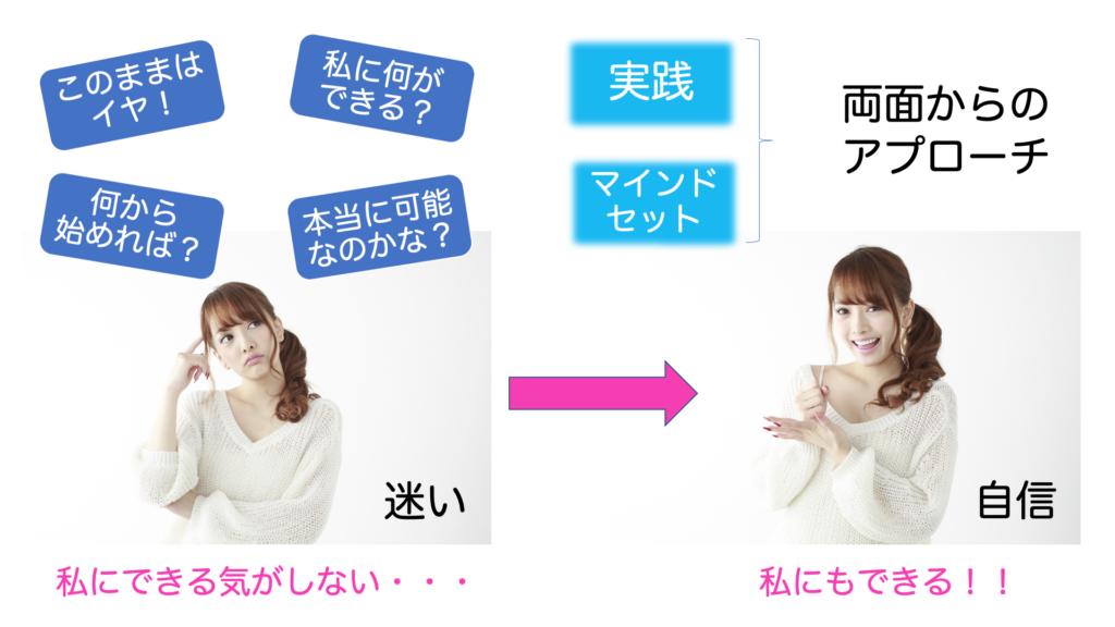 「実践」と「マインドセット」の両面からアプローチしたことで、自分に何ができる?何をすれば良いの?と途方に暮れていた状態から、「もっと人生楽しむ方法があるじゃない!」「私にだってできるはず!」と思えるようになり、前に進めるようになったのです。
