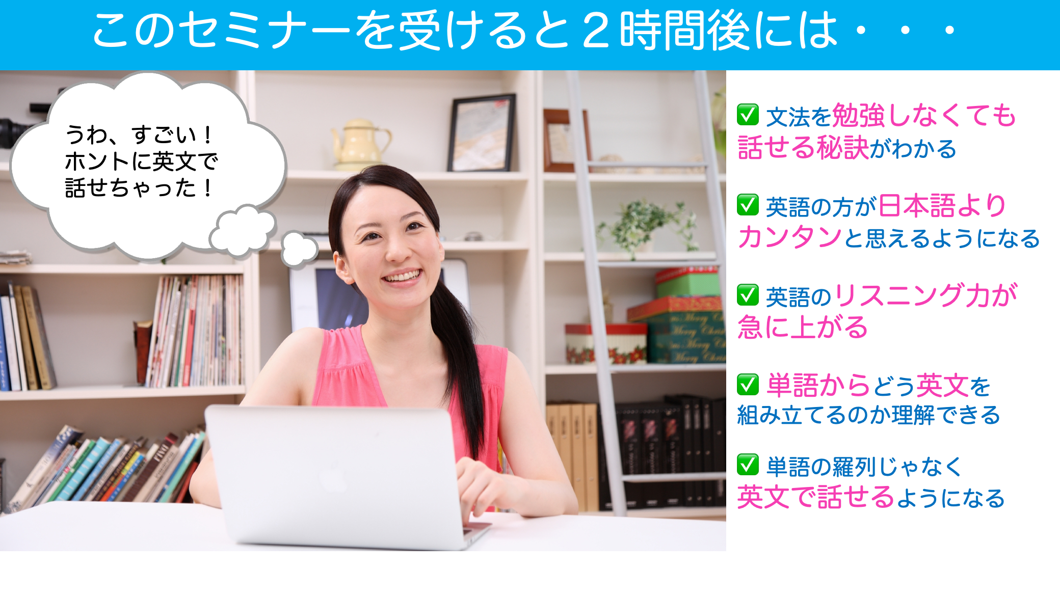 といっても、文法を勉強するのではないとしたら、どんな風に英文の組み立て方を知るの?と思われるかもしれませんね。そこで、それを今回、オンラインセミナーでお伝えすることにしました。
