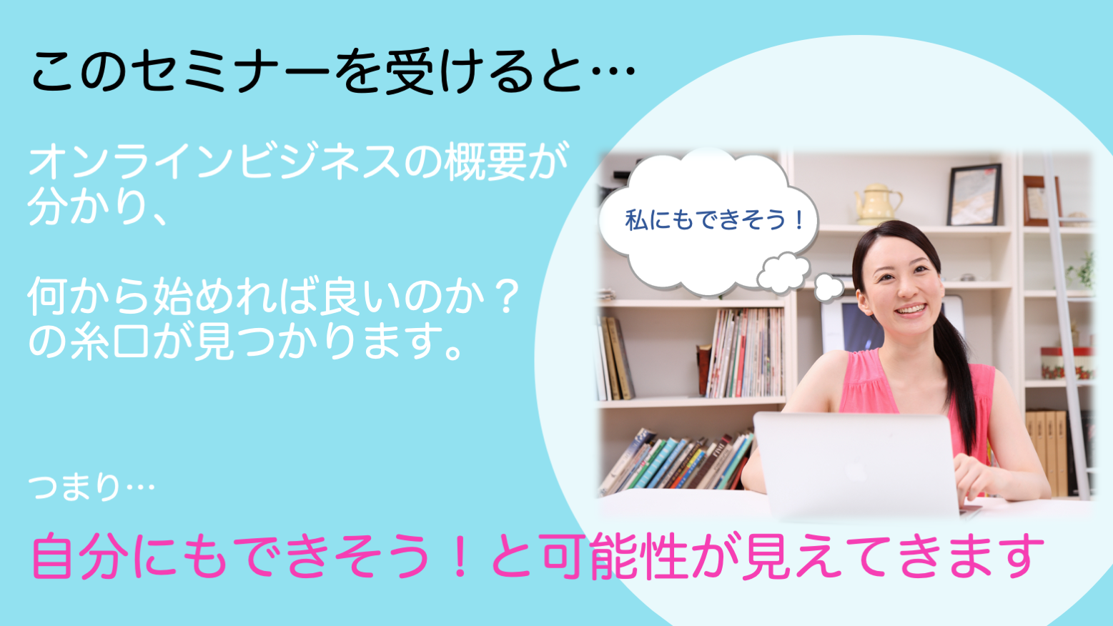 そこで、このセミナーでは、オンラインビジネスに関する情報をお伝えするだけでなく、あなたにどんなことができるのか?が見えてくるワークに取り組んでいただきます。そうすると、